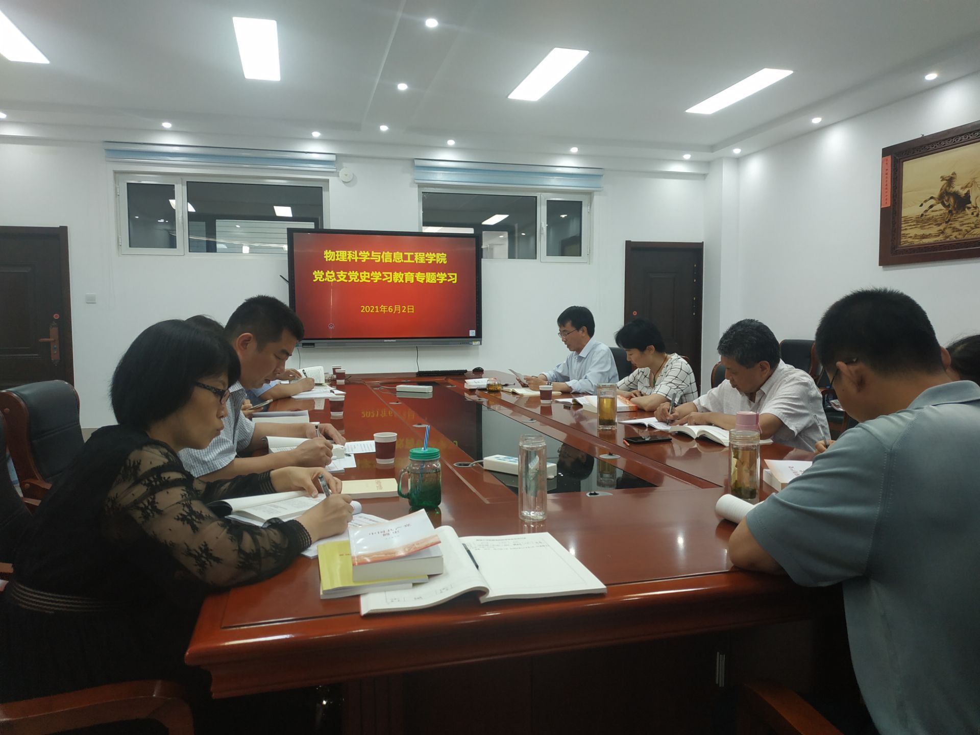 6月2日,物理科学与信息工程学院党总支开展党史学习教育专题学习。学院党总支成员、组织员和党支部书记参加学习。学校党史学习教育督导检查组第二组副组长魏爱平到会指导。
