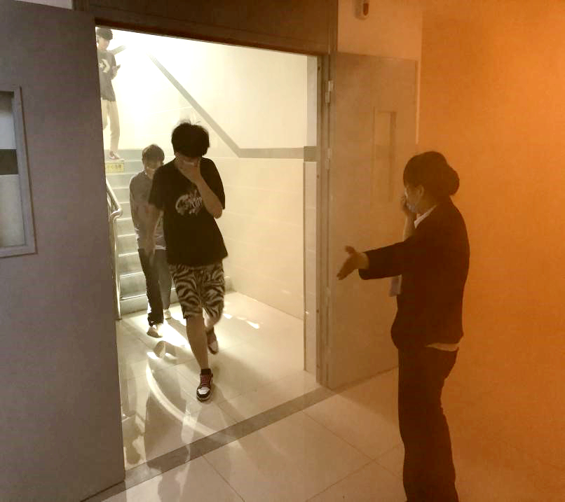 演练中,各楼管员确认火情后第一时间切断本楼电源打开应急灯并上报相关负责人,通知本楼义务消防队队长赶往现场协助灭火、警戒、维持秩序和组织疏散。