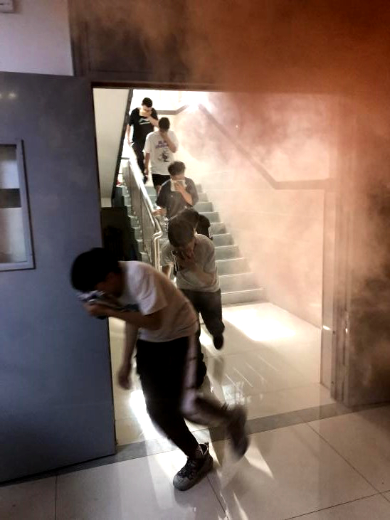 疏散过程紧张有序,同学们撤离时用湿毛巾捂住口、鼻,弯腰屈膝迅速撤离到安全地带。