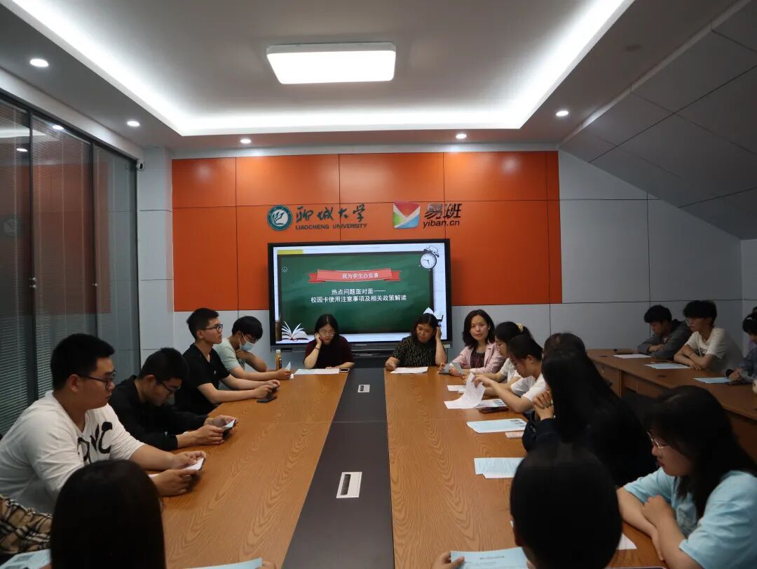 这是5月27日在大学生事务服务中心在易班工作会议室举办的“热点问题面对面”系列活动之“校园卡使用注意事项及相关政策解读”的活动现场。财务处收费科科长谷书平和校园卡主管刘峥作为特邀嘉宾参加活动。