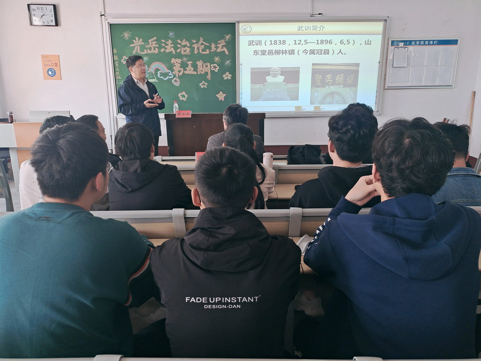 3月25日,法学院于西校区10#C620举办第五期光岳法治论坛。聊城大学公益慈善法治中心副主任王涛、李永军,卓越班班主任杨盛达及优秀教师綦保国参与活动。