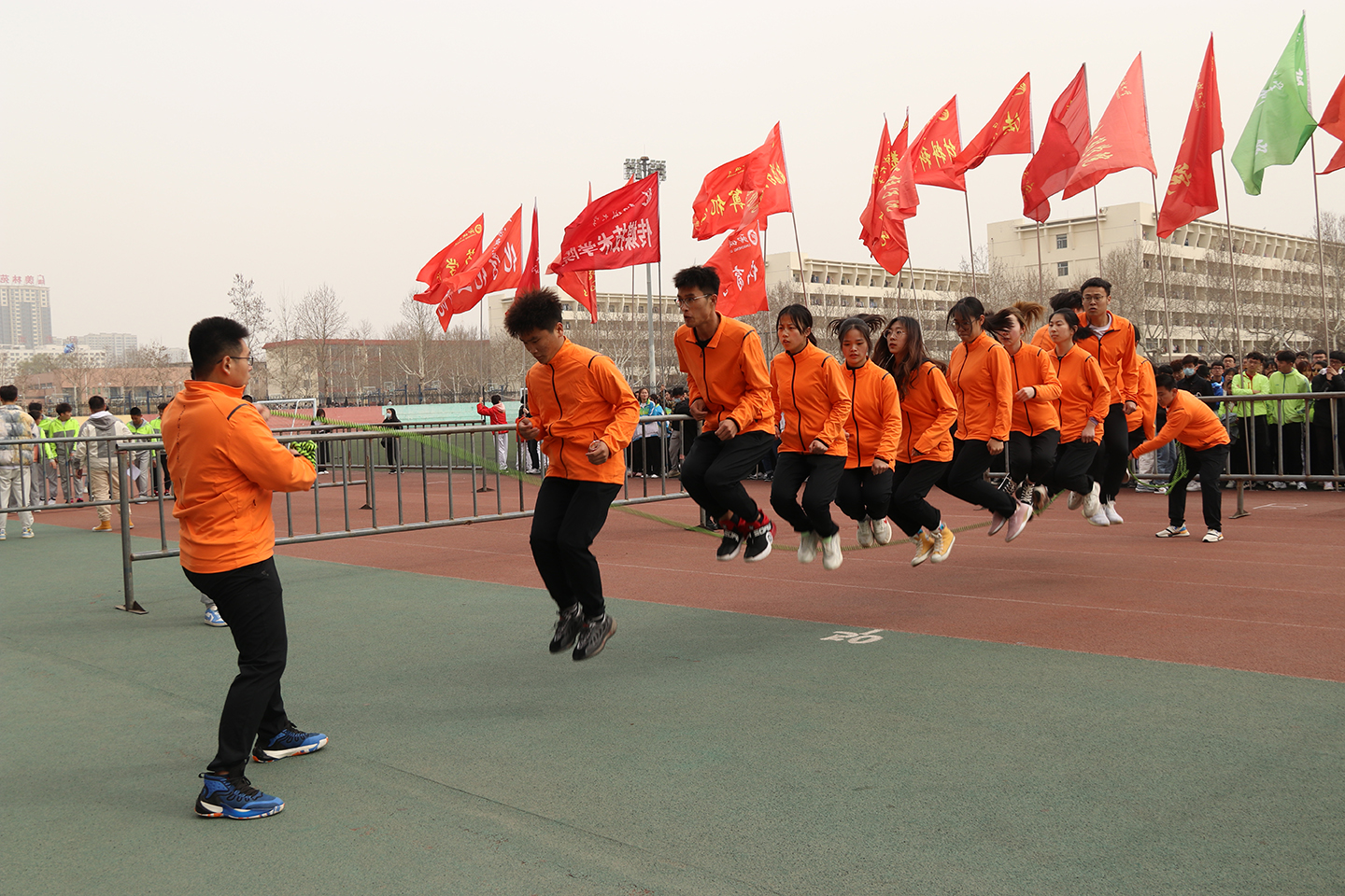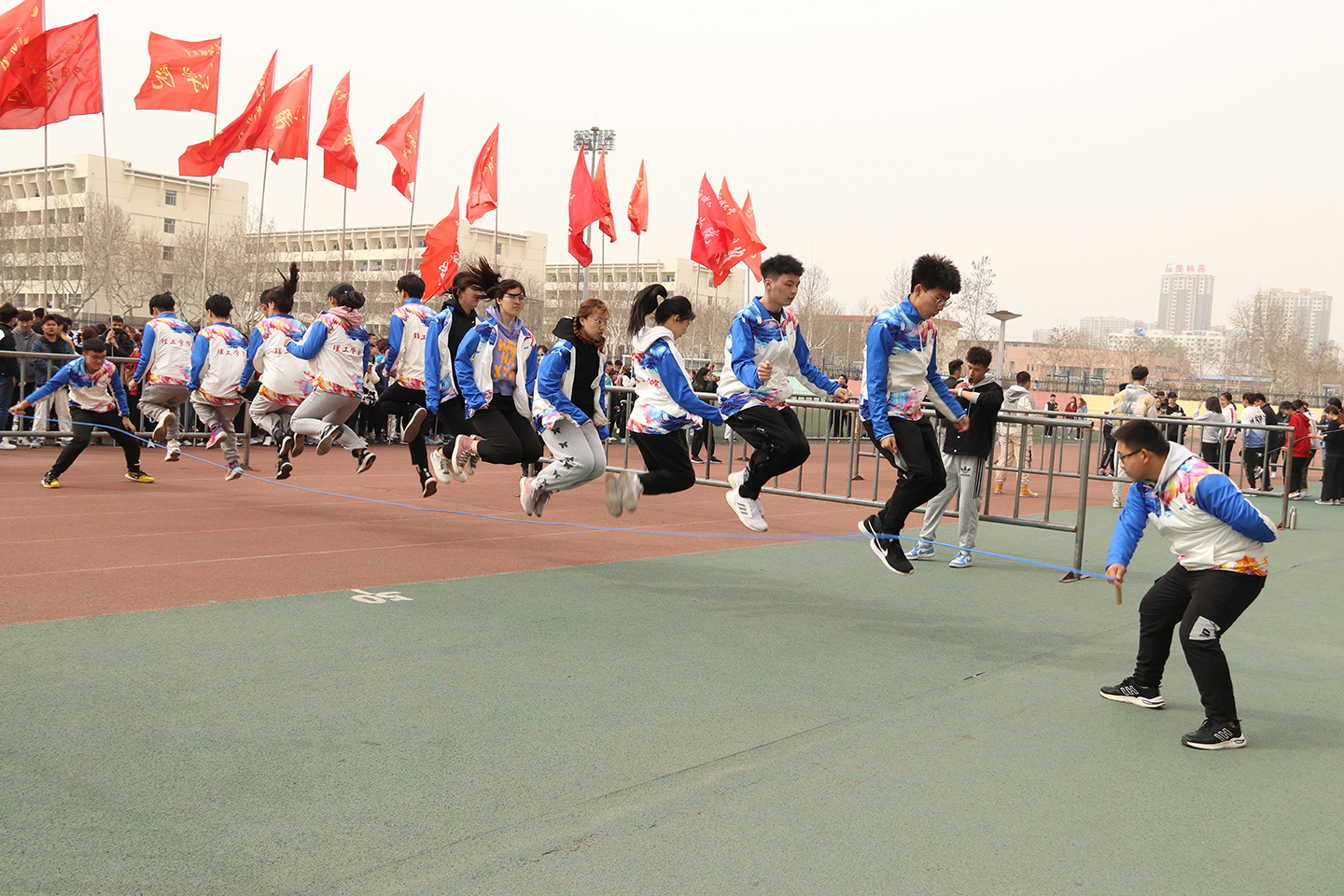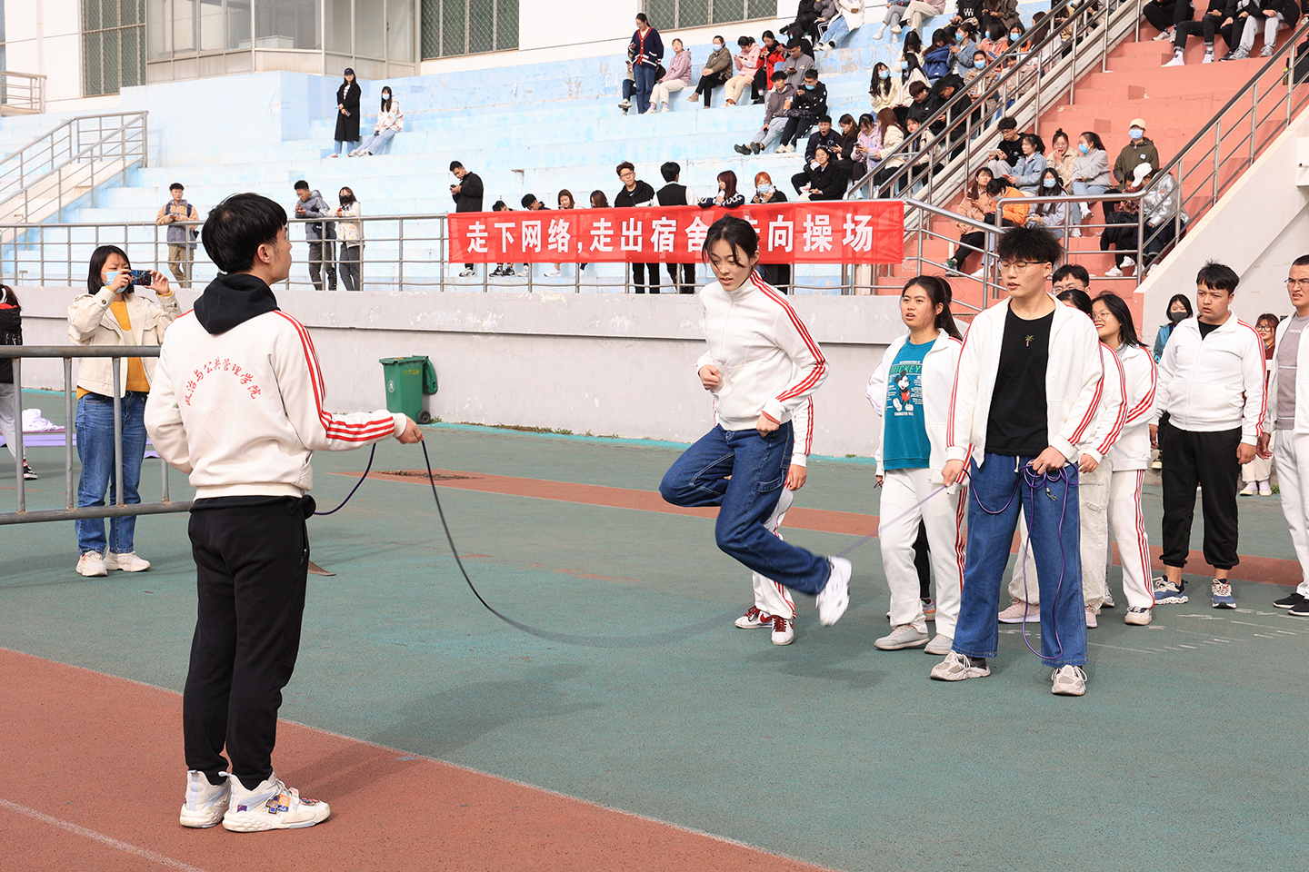 绿茵操场上,随着裁判员的一声哨响,各学院运动员犹如离弦的箭在长绳中来回穿梭,他们配合默契,奋力起跳,在紧张激烈的比赛氛围中,同学们秩序井然,表现出了顽强的拼搏意志、高尚的竞赛品质和极强的集体荣誉感。场下观众的呐喊声、加油声连绵不断,展现了我校良好的精神风貌和高涨的运动热情。