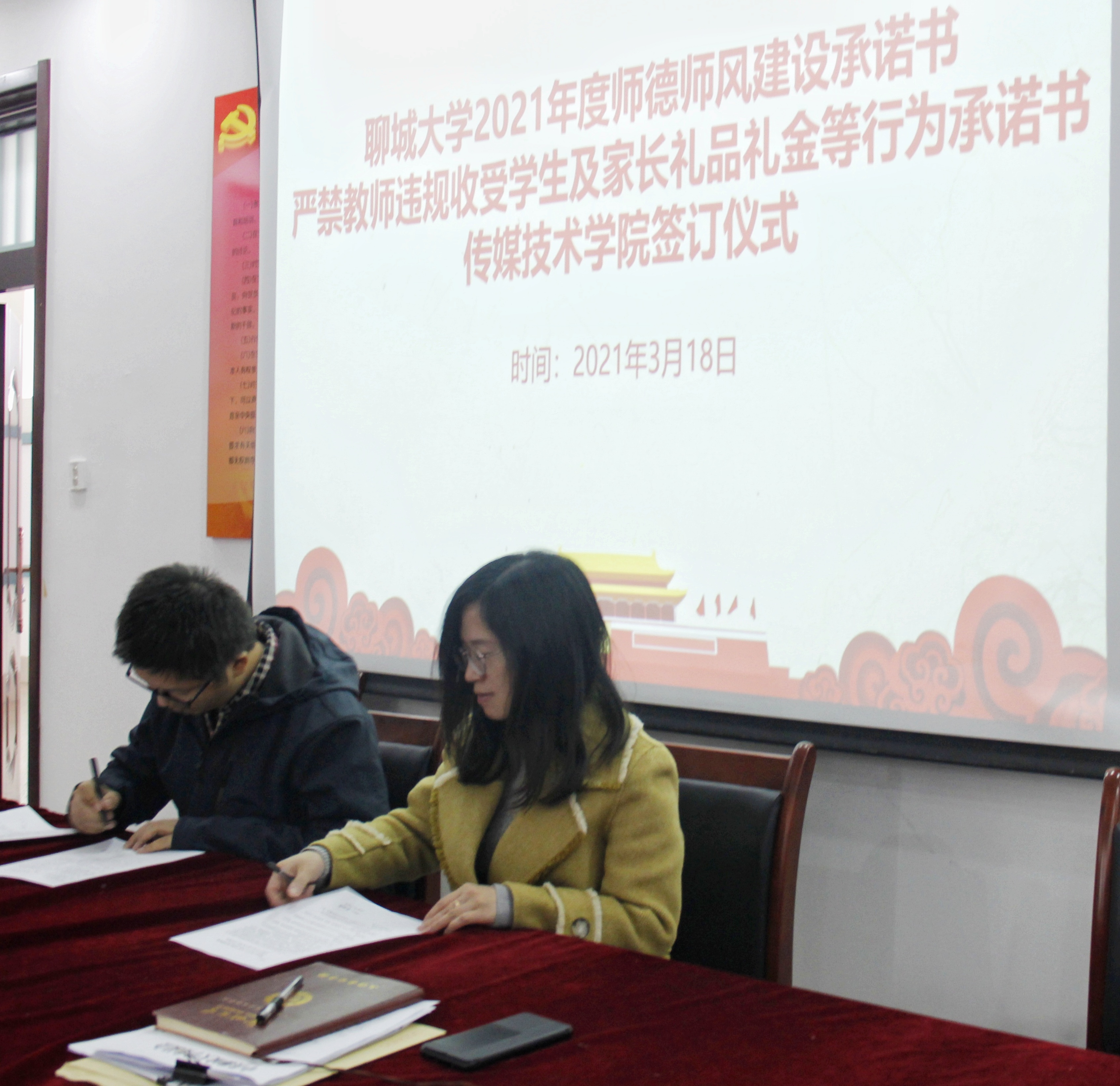 为全面落实教育部关于加强师风师德建设的方针政策,进一步提升教师队伍素养,激励广大教师努力成为有理想信念、有道德操守、有扎实学识、有仁爱之心的“四有”好老师,3月18日,传媒技术学院于11#505党员活动室举行2021年度师德师风建设承诺书、严禁教师违规收受学生及家长礼品礼金等行为承诺书签订仪式。传媒技术学院全体教职工参与了本次活动。