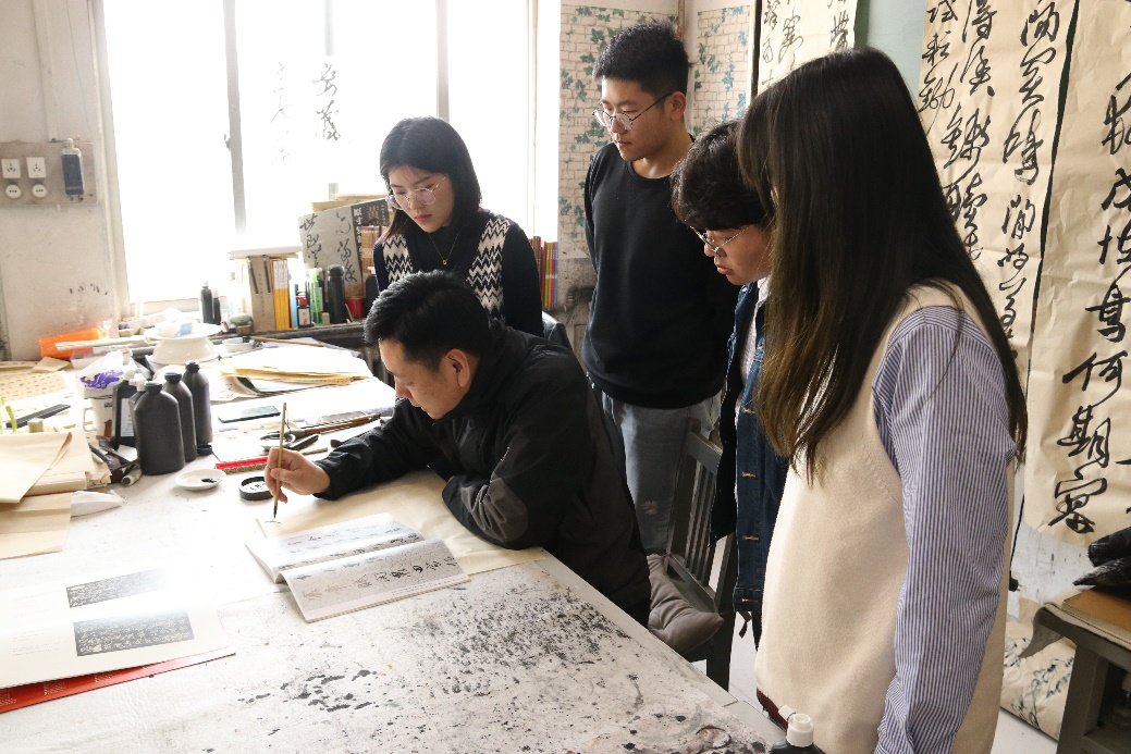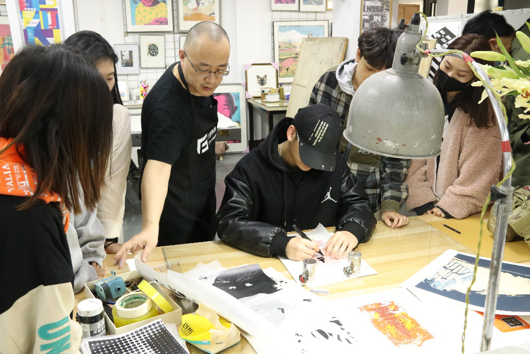 美术专业教师李健在其工作室为参展学生做培训指导。李健老师通过现场展示系列作品向同学们讲解了如何利用版画这个形式来表现庆祝中国共产党成立100周年的主题,并根据同学们的疑问以及实际创作中遇到的问题进行了解答,最后对同学们的部分作品一一进行了修改指导。