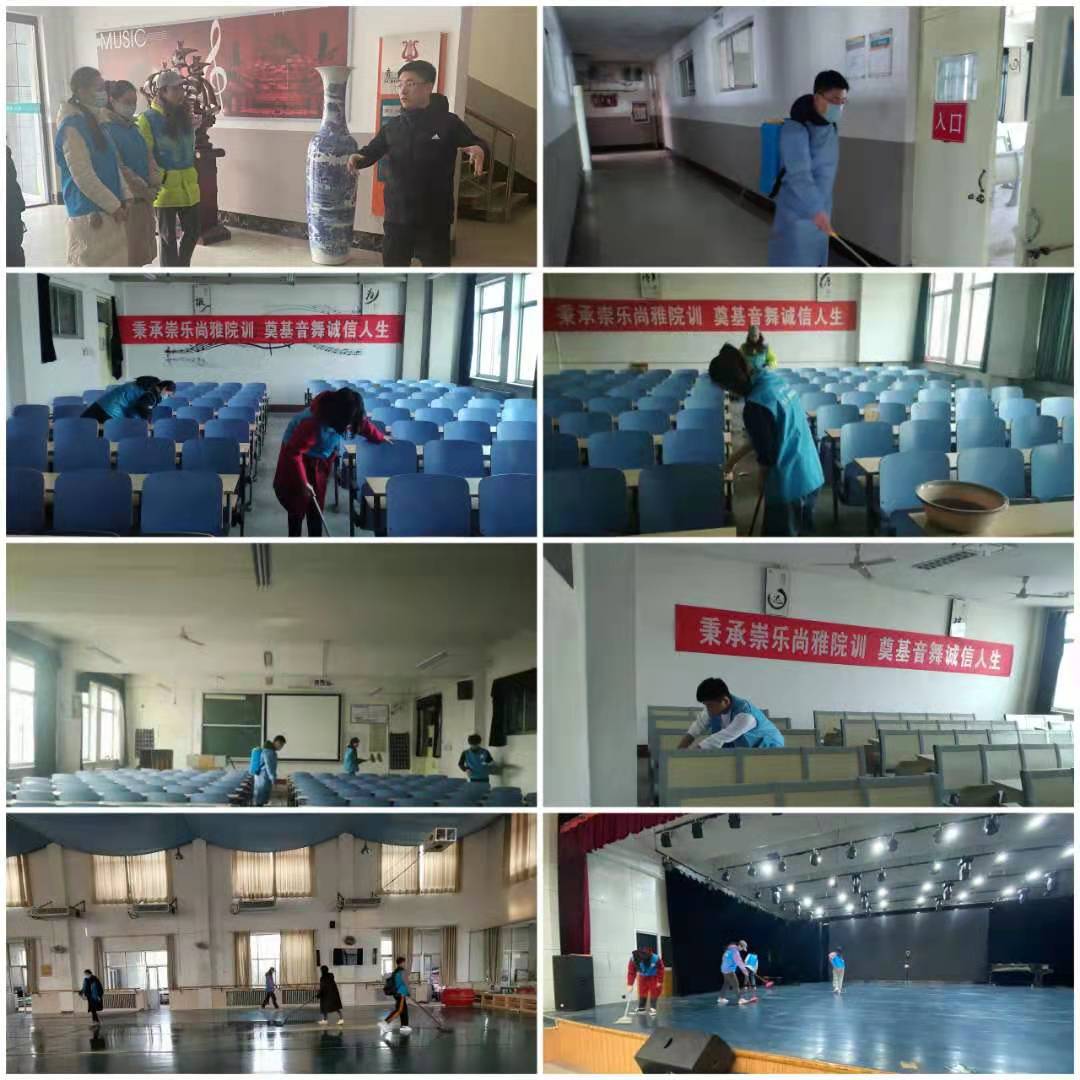 创设优美、整洁、卫生、安全的校园环境,确保全体师生的健康安全,确保学校能够顺利开学,2月26日下午,音乐与舞蹈学院全体辅导员带领17名志愿者对学院办公室、教室、舞蹈房、音乐厅、走廊进行全面的清扫、消杀。