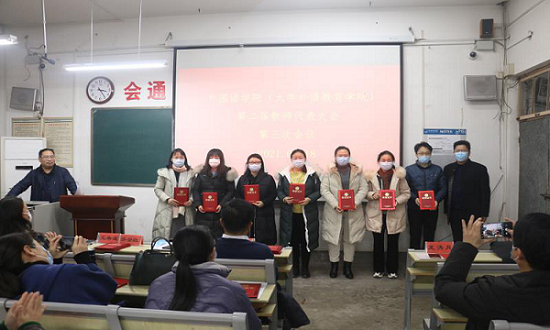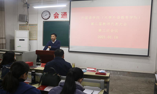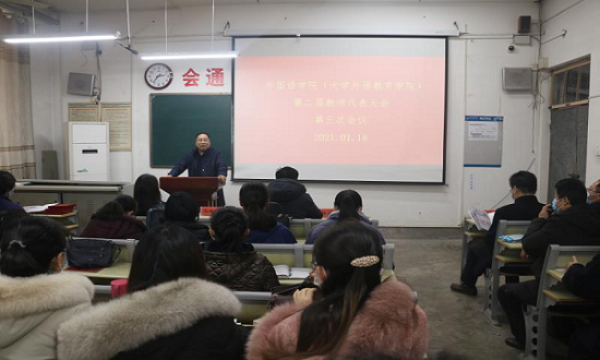 1月18日下午,外国语学院、大学外语教育学院第二届教职工代表大会第三次会议在西校区#1 A112举行,学院领导班子成员,教职工代表和部分教职员工参加此次会议。大会的主题是:认真学习贯彻习近平新时代中国特色社会主义思想,加强政治建设,提高政治能力,坚守人民情怀,夺取决胜全面建成小康社会、实现第一个一百年奋斗目标的伟大胜利,开启全面建设社会主义现代化国家新征程,为实现外国语学院2021年的目标任务而努力奋斗。