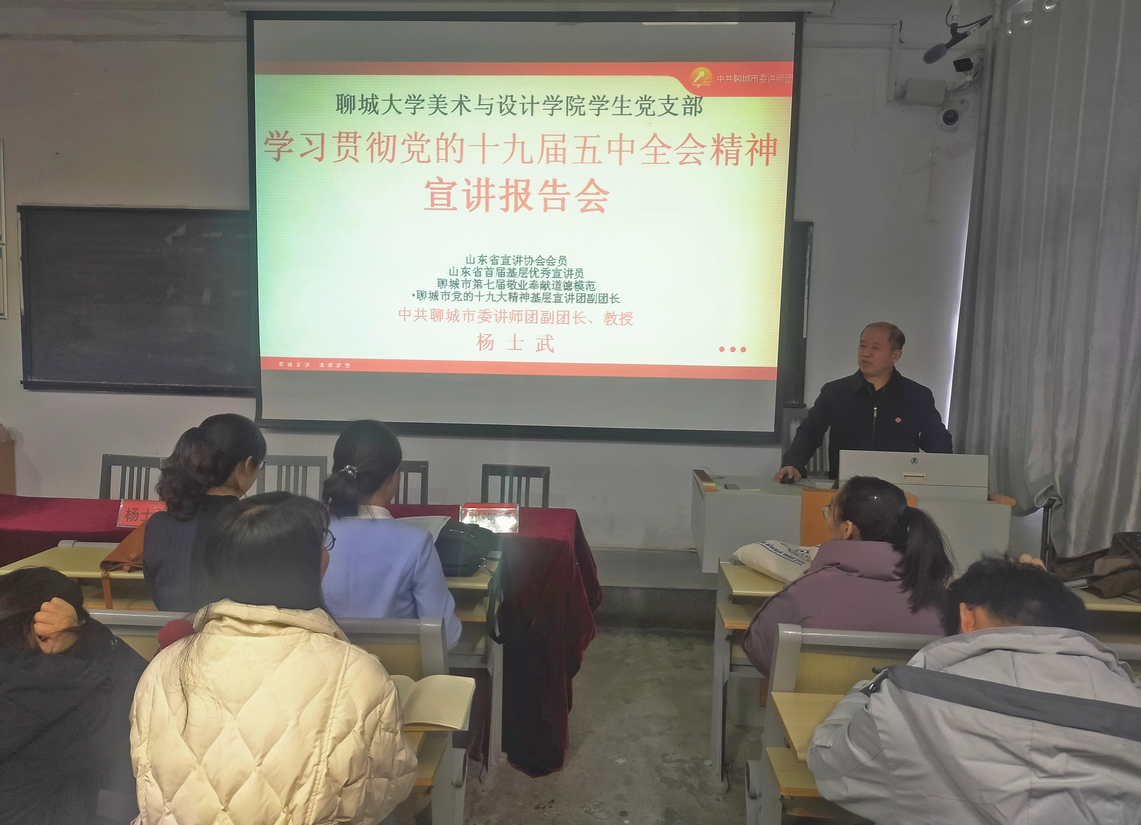 12月21日下午,美术与设计学院邀请中共聊城市委讲师团副团长杨士武教授就学习贯彻党的十九届五中全会精神讲专题党课。美术与设计学院全体学生党员、部分教工党员和部分学生积极分子100余人参加了本次党课学习。党课由学院党总支专职组织员许中美主持并总结。