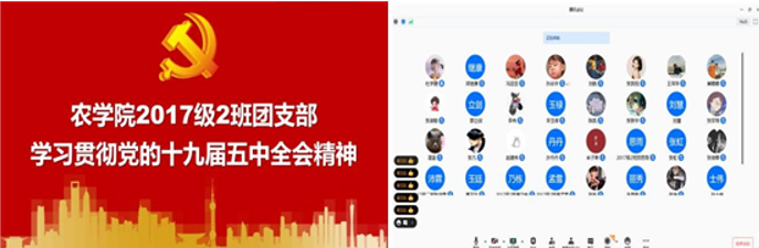 2017 级的同学们大都在紧张的准备考研、实习、工作中,但是大家仍积极学习全会精神,汲取精神营养。农学院 2017 级 2 班团支部通过线上学习的方式,集体学习十九届五中全会会议精神,会后开展了关于学习心得方面的畅谈。与会人员纷纷表示,作为一名新时代的大学生,我们应该奉献出自己的力量,铸牢中华民族共同体意识。同时,要坚定文化自信,勇担时代使命,不断丰富中华民族传统文化内涵,做中华文化的传播者、发扬者,让中华文化走向世界,让中国声音走向世界。