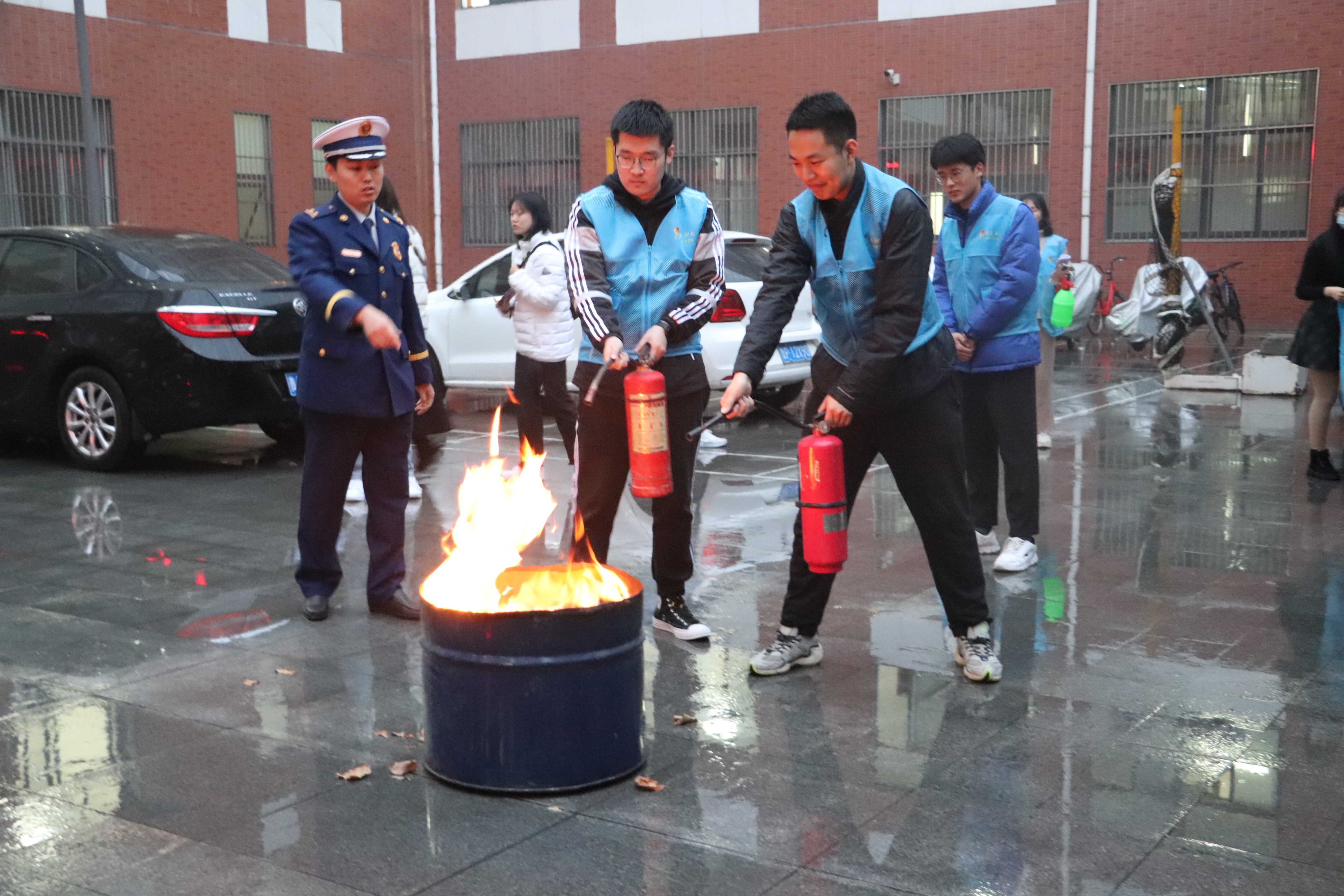 此次活动分为知识讲座与演练活动两部分。于聃围绕消防安全基础知识这一主题展开,从火场逃生与自救、常见灭火设施、家庭防火三方面进行讲解,强调掌握消防安全知识的重要性。在火场逃生与自救方面,于聃讲述了保持头脑冷静、果断逃生、智闯浓烟区等九个火场自救方法,重点讲述了被火围困在楼内房间和衣物着火时的具体做法。在常见灭火设施方面,于聃详细讲解消火栓和灭火器的使用方法。在家庭防火方面,于聃指出家庭火灾发生原因和家庭灭火方法。讲座结束后,为增加教学效果,于聃教官带领同学们在马克思广场亲自体验和观摩灭火器的使用方法,现场讲解“提、拔、握、压”四个使用步骤,帮助同学们学会正确使用灭火器。