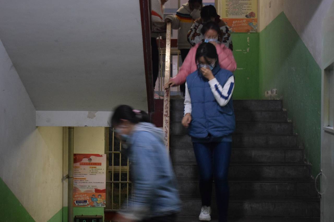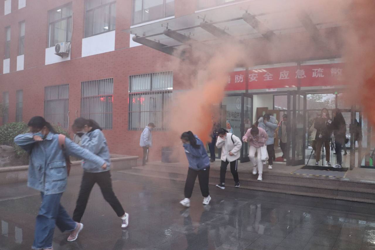 消防演练活动于教学楼和宿舍两个地点展开,浓烟滚滚,警报声响起,消防演练正式开始。宿舍一方,同学们冷静思考、迅速反应,相互敲门提醒逃生。弯腰低身,用手捂住口鼻,同学们贴着墙壁自觉排队有序撤离。在易发生拥堵的楼梯口,有志愿消防队成员引导秩序,同学们最终安全撤离到指定集合地点。教学楼一方,同学们排好队伍分成两列有序撤离教室,演练过程中同学们用湿毛巾捂住口鼻避免烟尘颗粒物进入,引导员带领同学们弯腰俯身前行,按照安全逃生路线进入疏散门,最终全体人员安全迅速撤离至学院马克思广场。此次演练自始至终有条不紊,整个过程衔接连贯、严谨有序。