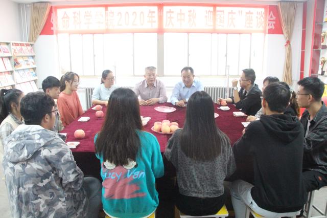 走访慰问后,院领导来到党员活动室,同学生代表们共同座谈,欢度双节。座谈会上,同学们逐一做了自我介绍,交流了假期安排,抒发了异地过节的感受。张金保深情地回忆起自己儿时的中秋节,在物资匮乏的年代享受过节时的丰裕和欢喜。他告诫同学们,要珍惜来之不易的新生活,要艰苦奋斗,勤俭节约。他指出,要做出合理的职业生涯规划,利用大学四年的黄金时期提升自己,成就未来,学院也将尽一切力量帮助同学们筑梦未来。同学们纷纷表示,理解并全力配合学校假期安排,充分利用时间提升自我。
