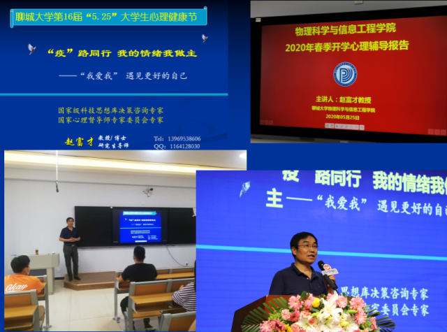 今年我校“5.25”心理健康节的主题是“‘疫’路同行,传递温情”,从5月18日持续到6月30日。除了参加山东省大学生心理健康节的各项心理健康教育活动外,我校心理中心与各学院推出了“线上线下”相结合的丰富多彩的心理健康教育活动,包括线上收看教育部华中师大心理援助热线平台6位专家的心理健康讲座、线上心理调查与测评、“爱就要说出来”之微课比赛、“我的战‘疫’心路”征文比赛、战“疫”成长案例、“与心灵相约,与运动相伴”、“阳光心理,健康防疫”系列活动、“稳定情绪 规划人生与最好的自己相遇”、“音乐联通南北,同奏心灵之声”、“心理手绘大赛”、“传递心声、化解烦恼”团体辅导等,共计120多项。