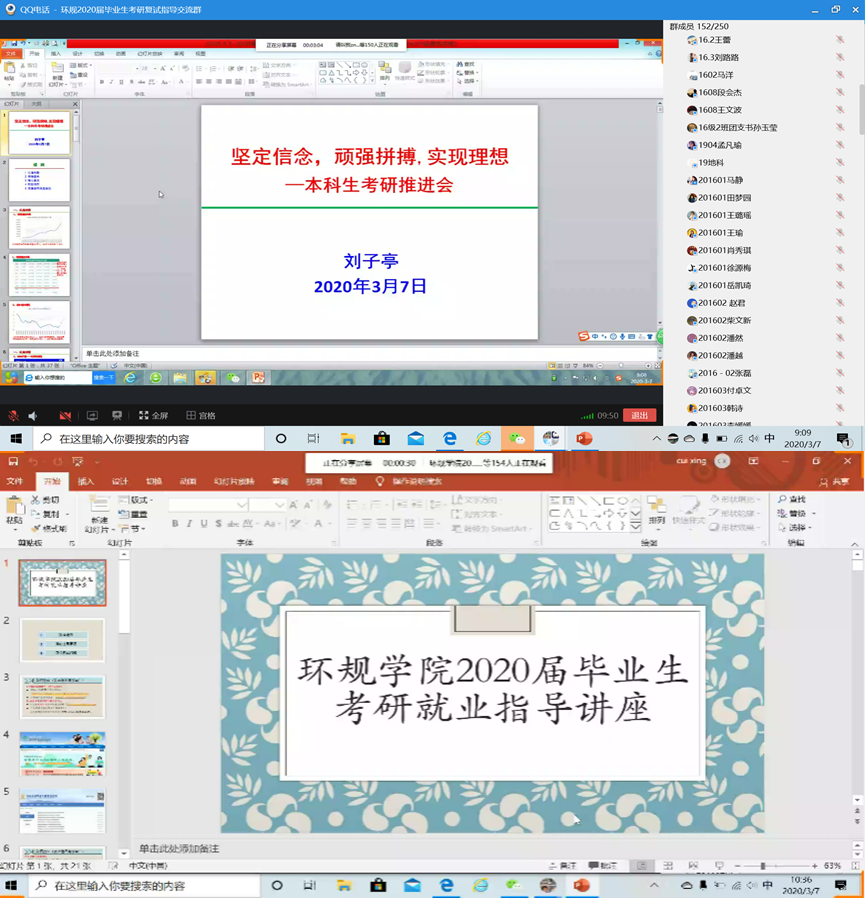 3月7日,环境与规划学院利用网络直播平台举办了“坚定信念 顽强拼搏 实现理想”考研复试与就业指导交流会,环境与规划学院副院长刘子亭、辅导员崔邢、各系主任、毕业班班主任以及2020届毕业生近200余人参与了本次线上指导交流会。