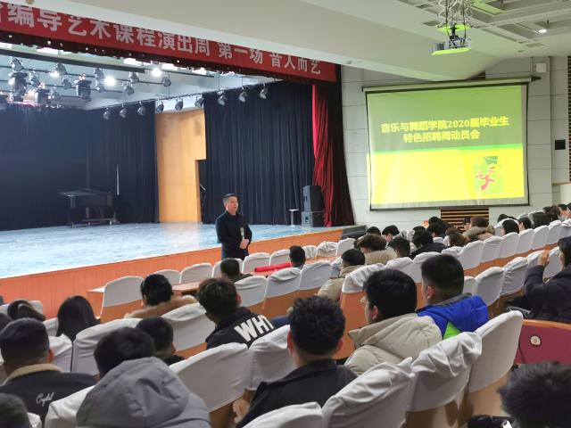 为更好地引导大四毕业生参与学校、学院组织的招聘活动,培养积极的就业观,帮助毕业生顺利就业,音乐与舞蹈学院于 12月23日在9号教学楼五楼音乐厅召开“音乐与舞蹈学院2020届本科毕业生特色招聘周动员会”。动员会由学院党总支副书记明辉主持,团委书记梁建新、全体辅导员、班主任以及2016级毕业生参加了此次会议。