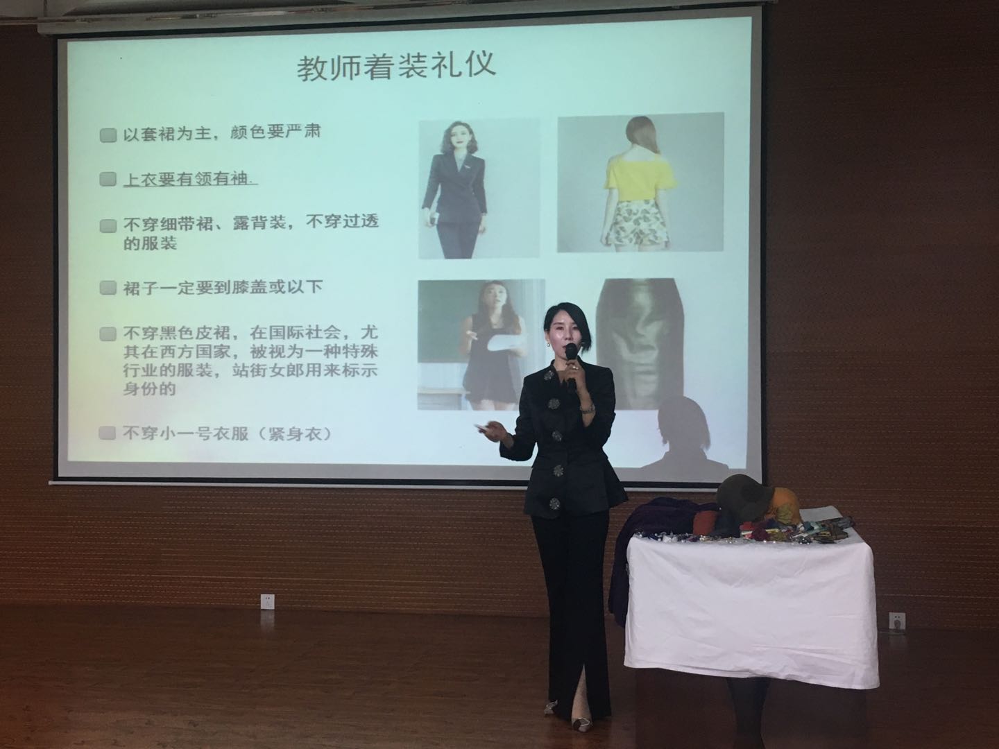 此次讲座,邀请了2位校外专业人士围绕高校教师形体礼仪、形象管理等方面的内容进行了讲解,对职业女性文明举止、文明礼仪及站姿、坐姿、走姿、蹲姿等日常礼仪进行了演示和指导,并通过自身示范、集体参与、现场变装等方式,对高校女教师的服装搭配和发型、妆容、服饰、配饰设计及个人适合色彩范围的选择、配色方案、美妆技巧等内容进行了指导。2位老师形象生动的语言和现场热烈的互动,使大家在轻松、愉快的氛围中掌握了职业女性塑造完美仪态、仪容的要领,提升了审美能力和综合素养。