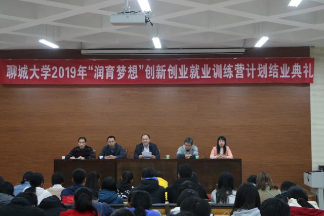活动伊始,王宇宣读聊城大学2019年"润育梦想"成长计划优秀学员名单。与会领导为8位创新创业就业训练营优秀学员代表颁布荣誉证书。随后,大家一同观看了训练营记录专题片。专题片记录了训练营专题讲座、企业参观、素质拓展、模拟面试、职场体验等系列精彩课程内容,展示了实践教育效果。