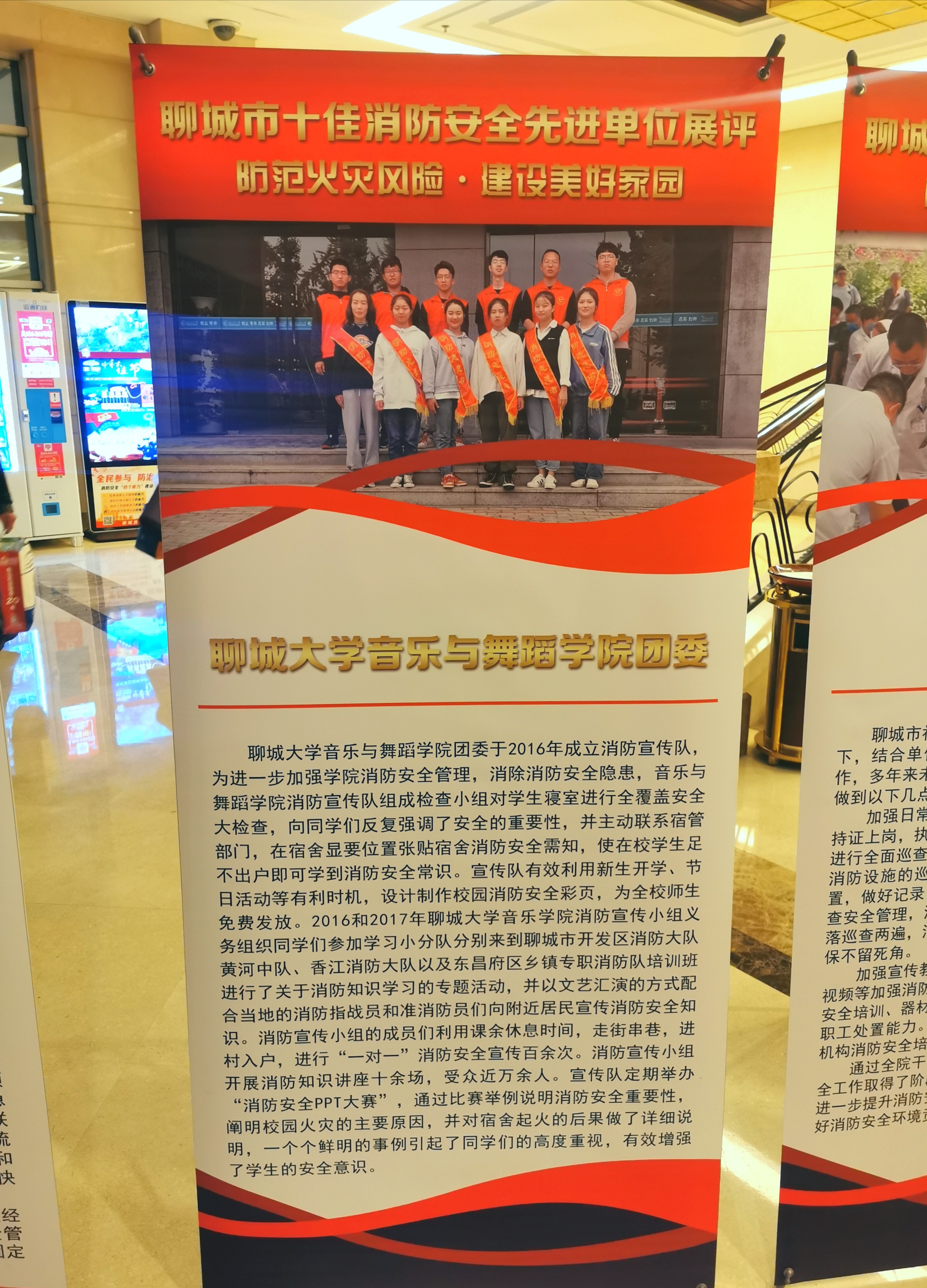 聊城大学音乐与舞蹈学院团委于2016年成立消防宣传队。宣传队队员围绕“防范火灾风险,建设美好家园”这一主题,践行习近平总书记授旗训词精神,把消防宣传教育培训置于基础性地位,不断深化消防宣传教育工作,以文艺表演的方式配合当地消防指战员和准消防员们向附近居民宣传消防安全知识。通过开展消防安全知识讲座、举办“消防安全PPT大赛”、走街串巷进行“一对一”消防安全检查等形式说明消防安全的重要性,有效增强了同学和居民的安全防患意识。