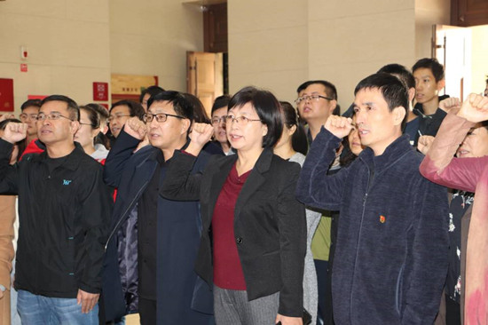 孔繁森汉白玉半身塑像前,全体师生党员向党旗庄严宣誓,重温入党誓词:“我志愿加入中国共产党,拥护党的纲领,遵守党的章程,履行党员义务,执行党的决定,严守党的纪律……”全体党员声音铿锵、句句千钧,神情庄重地许下对党和人民的承诺。