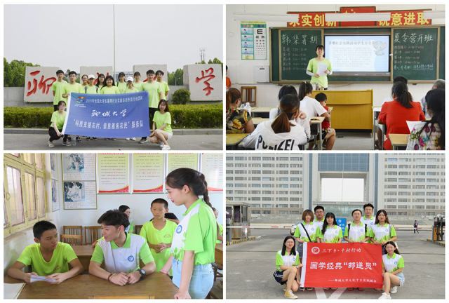 7月15日,“科技支援农村,信息服务农民”服务队开展2019年“乡村稼穑情·振兴中国梦”全国农科学子聚力乡村振兴暑期社会实践专项活动,志愿者们走进前姜小学,创新国学课堂,树立礼仪之范,开展了国学课、礼仪课等智慧课堂,与孩子们积极互动,用实际行动诠释“天下繁花桃李红”的真正含义。14至18日,文学院国学经典“邮递员”志愿服务队前往聊城市候营镇候营村和鱼山镇,从普通话推广、书法、楹联等五个方面,结合课堂教学与课外实践的综合特征开展了一系列特色教学,将文化的种子撒在孩子们心中,将爱的火苗延续在乡间土地。