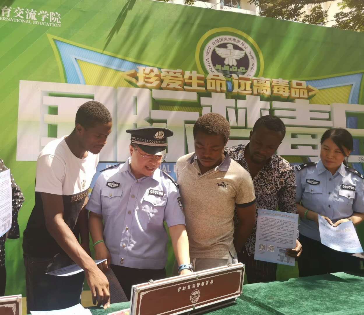 参加活动的警官们向国际学生宣讲禁毒知识,介绍我国有关禁毒的法律法规,指导国际学生严格遵守我国法律法规,明确告知同学们吸毒违法,贩毒有罪。