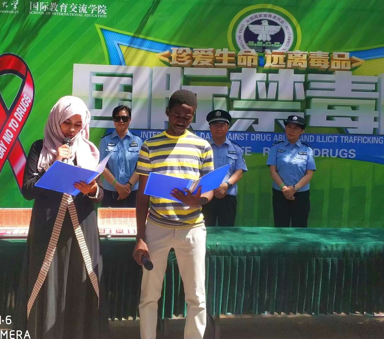 国际学生代表李美美和史宙瑞宣读“珍爱生命,远离毒品”承诺书,倡议大家要严格遵守中国守法律法规和学校校纪校规,拒绝诱惑,远离毒品,养成生活好习惯,建设美好朋友圈,建设自己的美好人生。