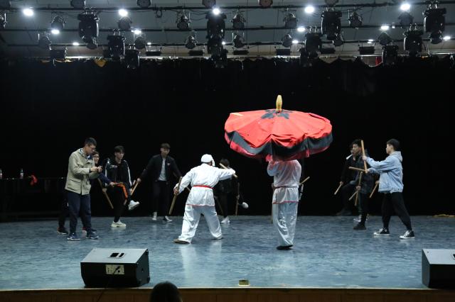 活动中,“运河伞棒舞”传承人崔合生为老师和同学们讲述了伞棒舞的历史源流,并与到场的其他老艺人一起展示了舞种艺术特点和技术要领。随后,同学们纷纷上台参与教学实践,在伞棒舞艺人侯风军、杜培付、张新利的指导下,大家慢慢熟悉了“伞”、“棒”、“板”动作要领,初步领略到了“伞棒舞”中蕴含的聊城民间文化特征,体会到这一艺术形式的魅力所在。