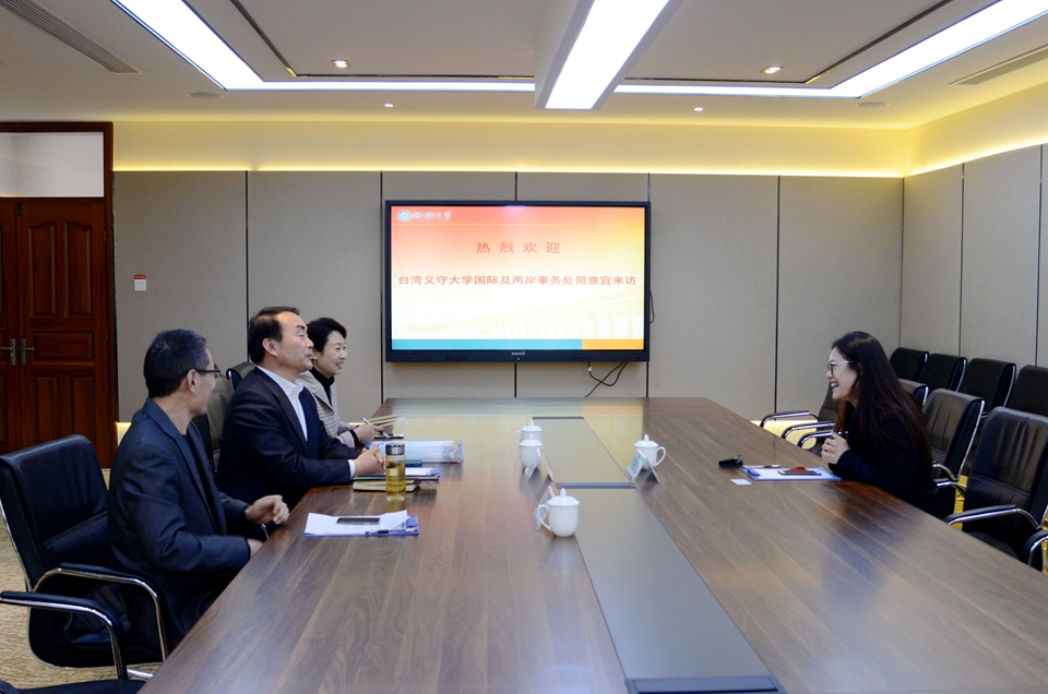 刘法力对义守大学客人到来表示热烈欢迎,介绍了我校的优势学科和办学特色。希望双方进一步加强多层次、多方面的教育交流与合作,充分发挥两岸高等教育各自的优势。今后将继续鼓励我校师生赴义守大学开展访学和交流学习,也欢迎义守大学师生来校交流,共同推进人才培养及学科发展。简意宜对我校的热情接待表示衷心的感谢,介绍了目前我校3名交换生在义守大学的学习生活情况,表示未来将探索更加灵活有效的交往合作方式,深化两校交流。