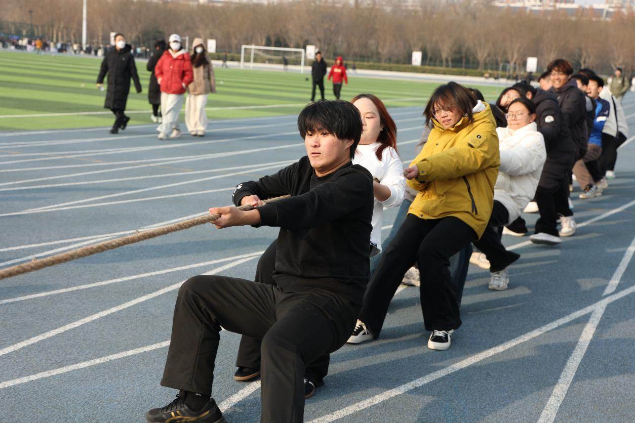 比赛现场气氛热烈,各学院代表队斗志昂扬。随着裁判哨声响起,参赛队员们紧握长绳,身体后倾、脚蹬地面,拼尽全力向后拉扯,每一寸绳标的移动都凝聚着团队的汗水与默契。赛场边,啦啦队的呐喊助威声此起彼伏,加油声、口号声震耳欲聋,将比赛氛围推向一个又一个高潮。工作人员与志愿者全程坚守岗位,从赛前检录、赛场执裁到赛后秩序维护,以专业负责的态度保障了赛事的平稳有序进行。