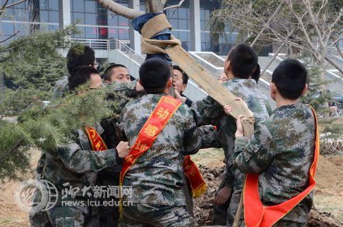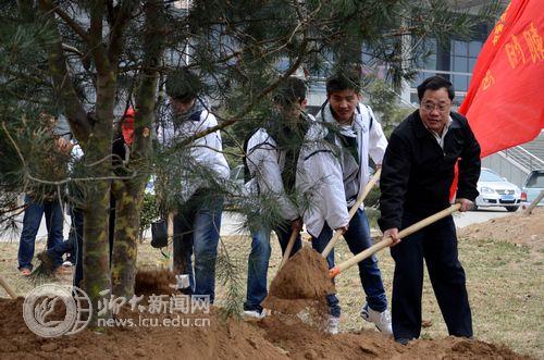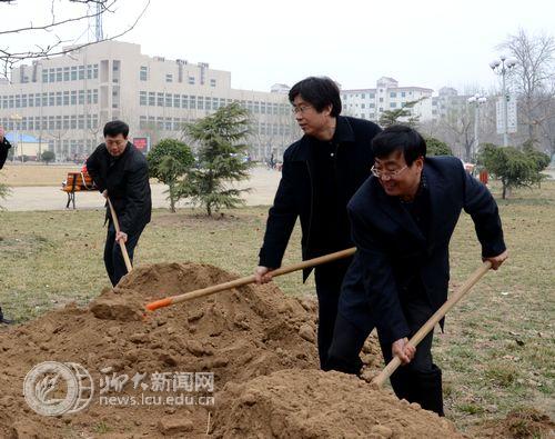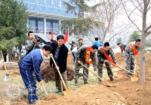3月12日上午,迎着温暖的春风,校领导马春林、张贵桥、冯健、王强、孔祥华、张跃飞与后备军官学院、环境与规划学院志愿者一起,在逸夫图书馆前植下松树等绿色苗木,为初春的校园再添一抹新绿。