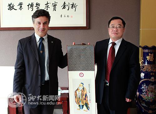 交谈中,马春林向客人介绍了我校历史沿革和建设发展的成就。弗拉维奥•科拉迪尼校长介绍了卡梅里诺大学的地理位置、学校环境、师资力量、优势学科专业等情况。双方希望以此次访问为契机,推进两校的广泛深入合作。