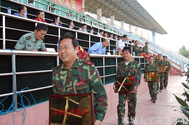 大会在庄严的国歌声中拉开了帷幕。军训团进行了训练课目汇报表演,博得了在场观众的热烈掌声。军训团团长李庆炎宣读了聊城大学2007级学生军训先进集体、先进个人名单,环境与规划学院等五个学院获得军训先进连队,政法学院等五个学院获得队列训练优胜连队,历史文化学院等五个学院获得作风纪律优胜连队,化学化工学院等五个学院获得内务卫生优胜连队,建工学院等五个学院获得歌咏比赛优胜连队。徐志全等24人获得优秀教官称号,宗金北等30人获优秀带队老师荣誉称号,李文等673人获军训先进个人荣誉称号。