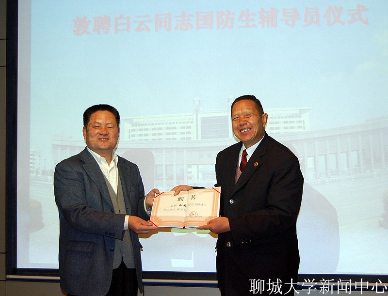 曾被评为“山东省劳动模范”“全国检察系统优秀刑检干部”“全国十大杰出检察官”的白云在受聘仪式上说:“作为一名辅导员,我会履行职责,尽心尽力为国防生服务。”白云鼓励国防生尽快成长、好好成才,并表示要做好国防生的思想政治工作,为聊大的国防生培养贡献自己的一份力量。