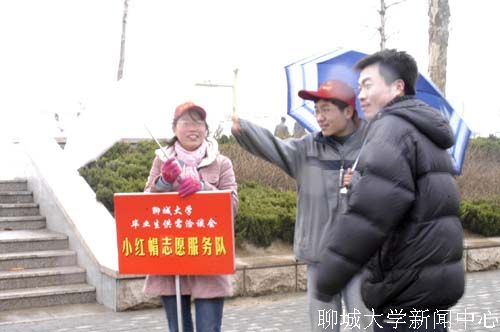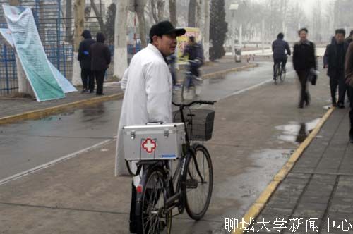 突降雨雪,小红帽依然热情 校医院派出两名医师,随时为大家服务