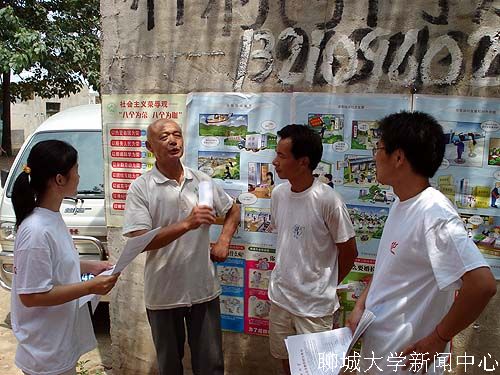 生命科学学院“知行”服务队在7月7日下乡到沙镇宣传过程中,遇到了中国农技协聊城分区的郭培田老人。老人家看到志愿者在当他散发有关宣传农民政策的传单和张贴新农村建设宣传画,便上前热情地做了自我介绍,并与志愿者一起,为过往行人解答关于农业方面的政策及优良选种、科技种田等内容。