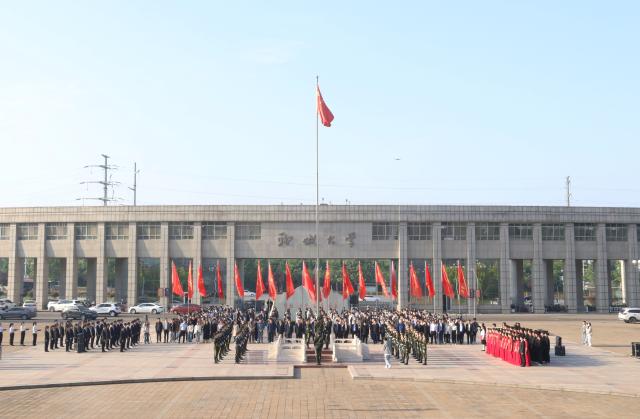 朝阳升起之际,54名青年代表双手托举五星红旗,共同完成共计54秒的传旗仪式,象征新一代青年将赓续五四精神血脉,不负韶华,不负时代,不负人民,勇攀高峰,勇毅前行。伴随着激昂的《义勇军进行曲》,五星红旗冉冉升起,参加仪式的全体师生庄严肃立,齐唱国歌。
