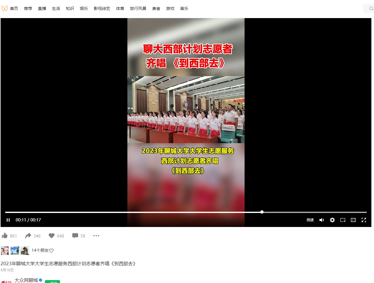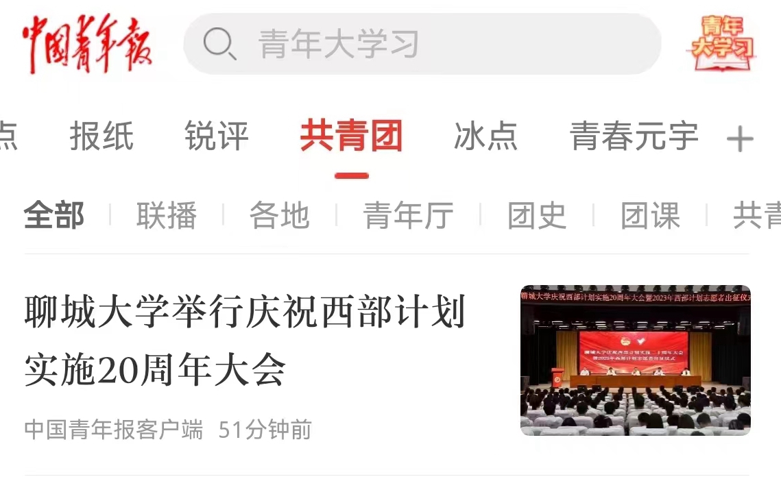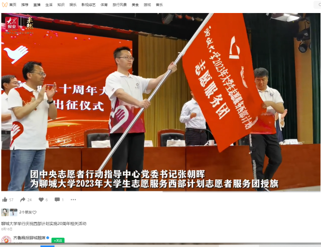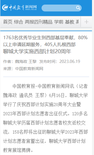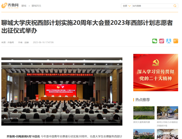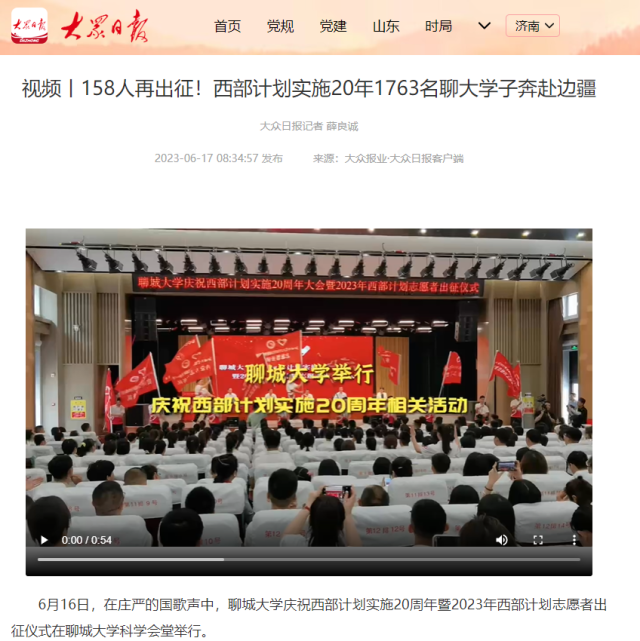 【编者按】近日,【中国青年报客户端】【中国教育新闻网】【大众日报】【齐鲁网】【齐鲁晚报】等多媒体平台报道我校庆祝西部计划实施20周年大会暨2023年西部计划志愿者出征仪式举办,报道学校西部计划工作发展历程、育人实效,展现了我校西部计划育人品牌和西部计划的“聊大现象”。