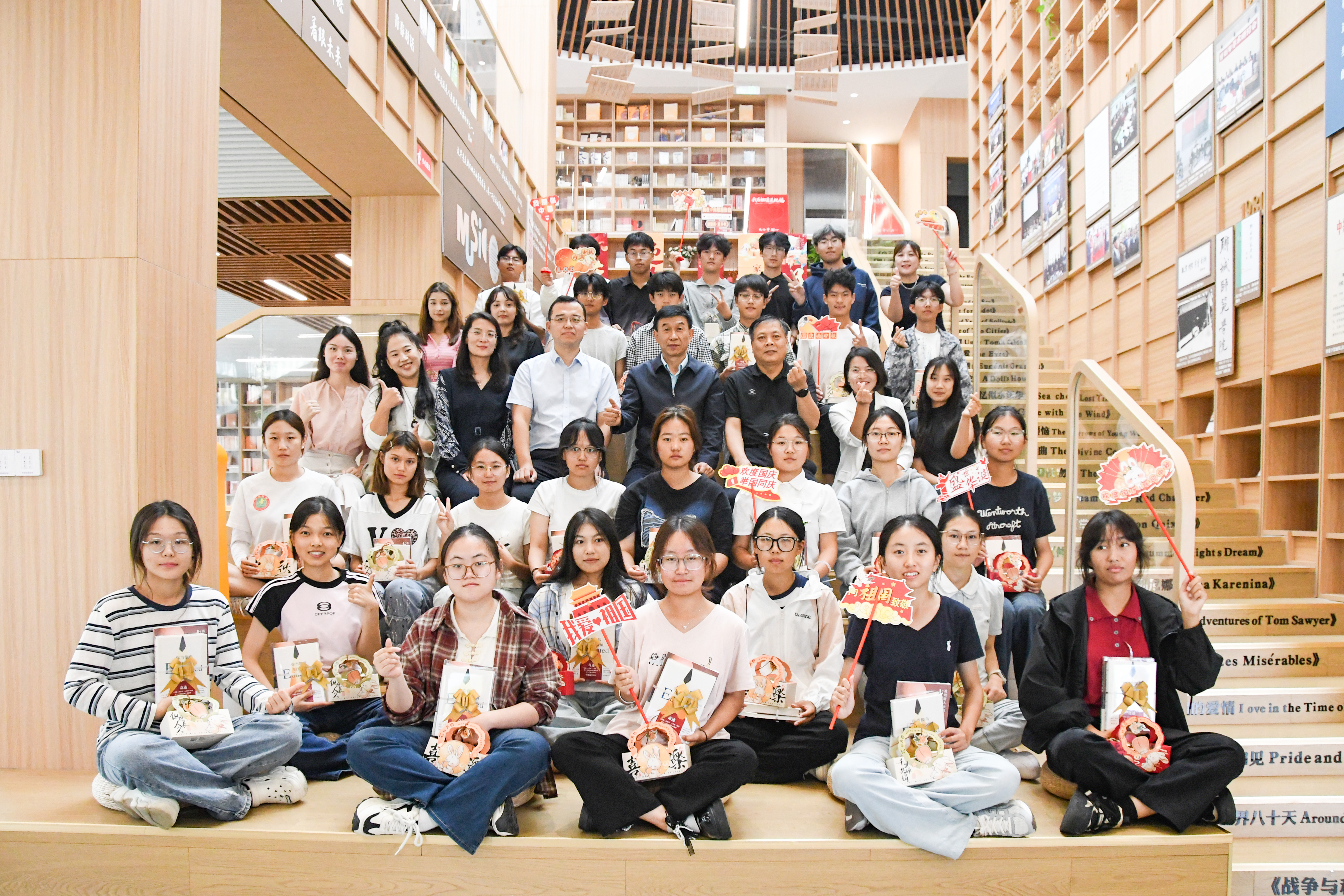 交流结束后,活动进入“送祝福”阶段。赵明吉与在场老师一同将精心准备的书籍及中秋慰问品送至同学们手中。《你当像鸟飞往你的山》《高效能人士的七个习惯》等读物不仅是一份礼物,更承载着师长的殷切期望。赵明吉勉励同学们以书为翼,在阅读中汲取智慧、涵养心灵,与先贤对话,不断提升自我。随后,师生共同合影,记录下这温暖难忘的时刻。