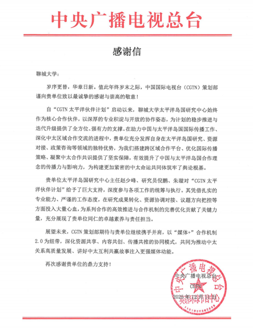 近日,中央广播电视总台CGTN向聊城大学发来感谢信,对聊城大学太平洋岛国研究中心在“CGTN太平洋伙伴计划”系列活动中给予的支持表示诚挚感谢。