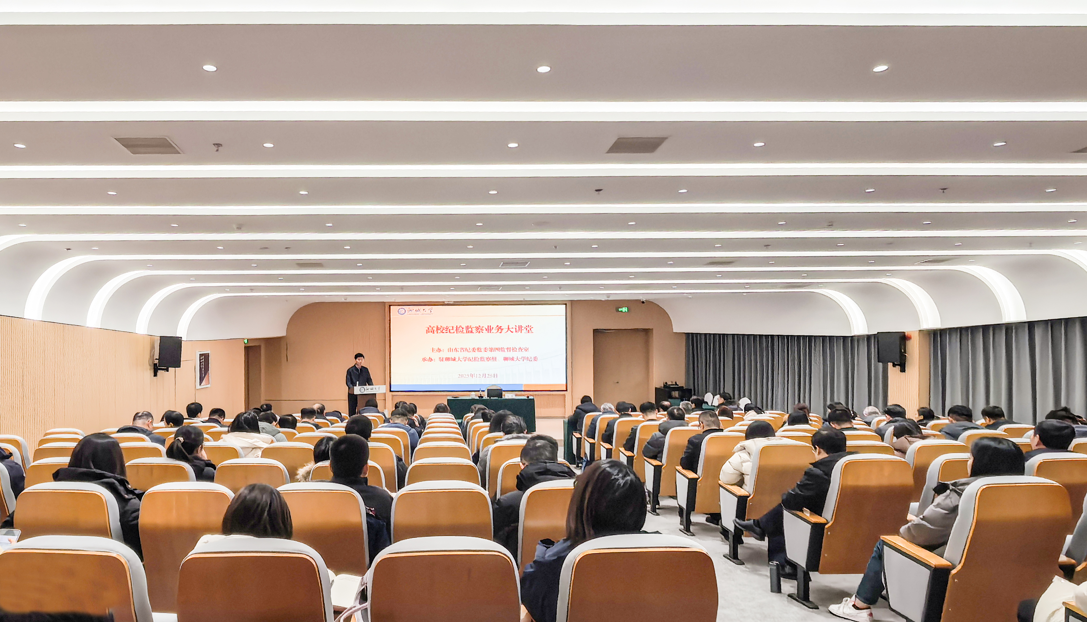 12月25日,2025年高校纪检监察业务大讲堂在我校举行。省纪委监委驻校纪检监察组组长,校党委常委、纪委书记高秀鹏主持开班式并致辞。