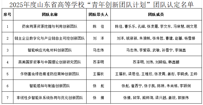 “山东省高等学校青年创新团队发展计划”是山东省教育厅为推进高校高质量发展、加强人才队伍建设、提升科技创新能力而实施的重要项目。该计划旨在支持高校青年博士面向科技前沿和重大发展战略开展创新性、探索性、应用性研究,培养和造就一批政治素质过硬、学术基础扎实、具有突出创新能力和发展潜力的青年科研创新群体。