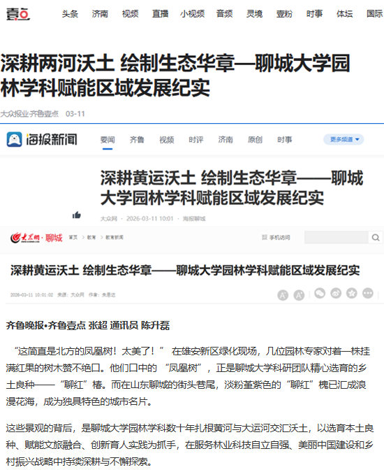 【编者按】继 2月3日中国科学报 、 大众日报、中国日报网、环球日报·环球网、中国科学网、澎湃新闻等媒体 以《聊城大学“聊红槐”:一枚“绿色芯片”的育种长跑》为题报道我校园林学科培育推广国槐新品种 “ 聊红槐 ” 的事迹 后,3月11日,齐鲁壹点、海报新闻、大众网、齐鲁晚报网、新浪财经等媒体以《 深耕两河沃土 绘制生态华章 —— 聊城大学园林学科赋能区域发展纪实 》 为题,全面报道了我校园林学科服务林业科技自立自强、美丽中国建设和乡村振兴战略的坚守与创新。