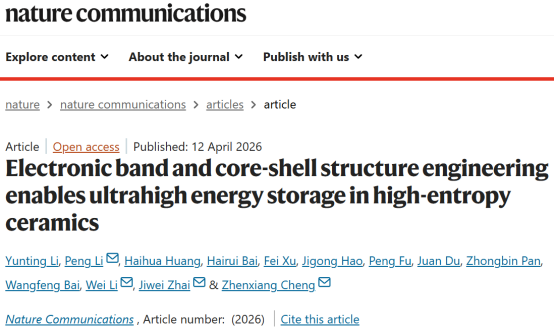 《电子能带与核壳结构工程实现高熵陶瓷中超高储能性能》 这篇论文,第一作者为我校研究生李云婷,该研究通过高熵设计驱动形成核壳异质结构,构筑阻止电击穿的屏障。研究者通过电子能带与核壳异质结构协同设计,最终在高熵陶瓷中获得了优异的储能性能其研究成果,为无铅储能陶瓷在高功率脉冲储能系统、航空航天飞行器高能效动力系统以及新能源汽车快充快放等领域的应用提供了科学支撑。