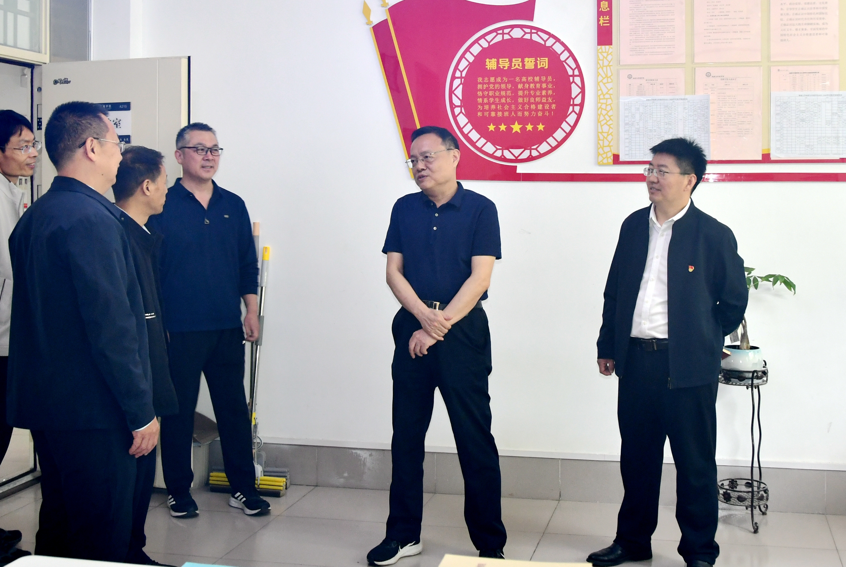 调研过程中,孙奇宏考察了学院教学科研文化设施,参观了学生就业指导空间、考研风采展,并与辅导员老师亲切交谈,勉励大家坚守立德树人的初心,做学生成长路上的知心人和引路人,用爱心与智慧点亮青年梦想、护航青年成长。
