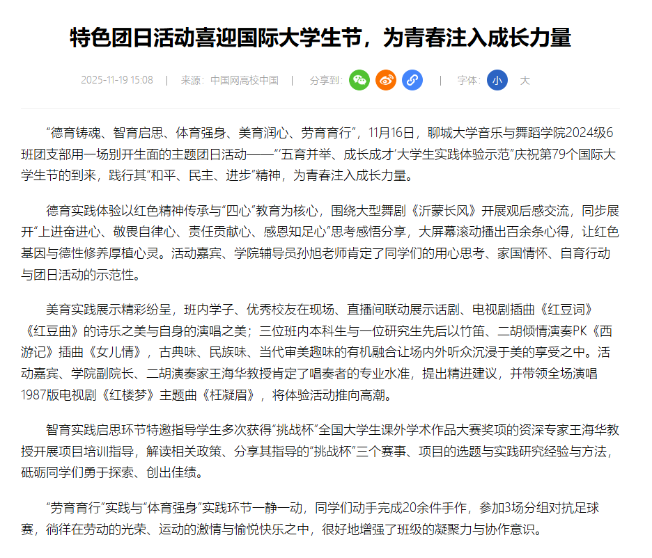 11月19日,【中国网】【山东教育报】以《特色团日活动喜迎国际大学生节,为青春注入成长力量》为题报道了聊城大学音乐与舞蹈学院特色主题团日活动。“德育铸魂、智育启思、体育强身、美育润心、劳育育行”,聊城大学音乐与舞蹈学院2024级6班团支部于11月16日用一场别开生面的主题团日活动——“‘五育并举、成长成才’大学生实践体验示范”庆祝第79个国际大学生节的到来,践行其“和平、民主、进步”精神,为青春注入成长力量。山东商报山海新闻、聊大新闻网、新青年网等媒体也同步予以关注报道。