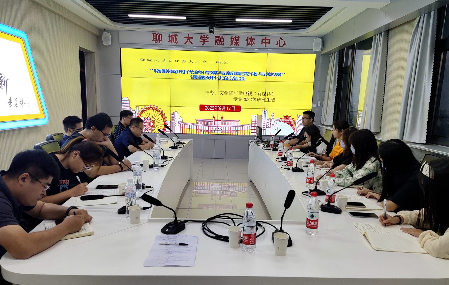 9月17日下午,我校文学院、传媒技术学院10位研究生、本科生组成的课题研究组于学校融媒体中心组织举办“物联网时代的传媒与新闻变化与发展”主题研讨交流会。文学院广播电视学系主任、副教授纪楠,传媒技术学院教师何德民、徐牧,党委宣传部秦治洲、齐鲁晚报聊城站记者张超作为指导教师参加现场研讨,中国青年报记者只恒文线上发言指导。