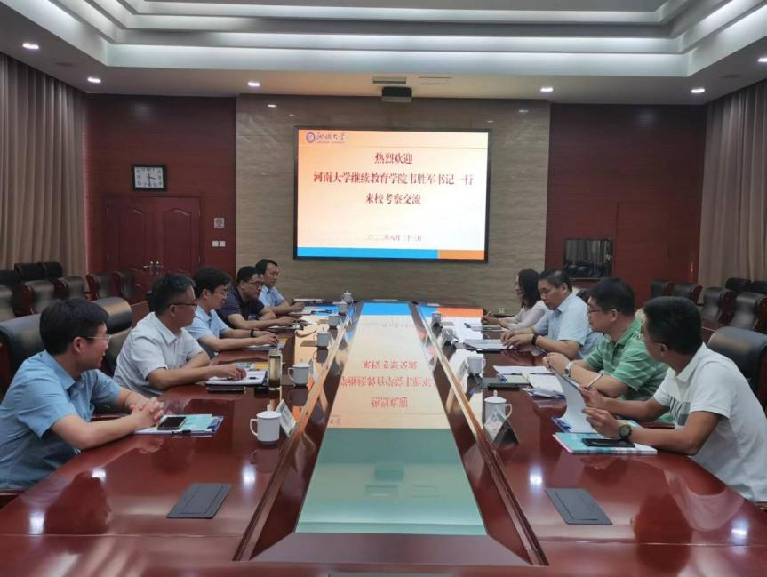 8月23日,河南大学党校常务副校长、党委组织部副部长、干部培训中心(继续教育学院)党总支书记韦胜军,干部培训中心(继续教育学院)主任(院长)袁凯强等一行7人来我校交流座谈,继续教育学院院长王伟,副书记、副院长张耕等参加本次交流座谈。