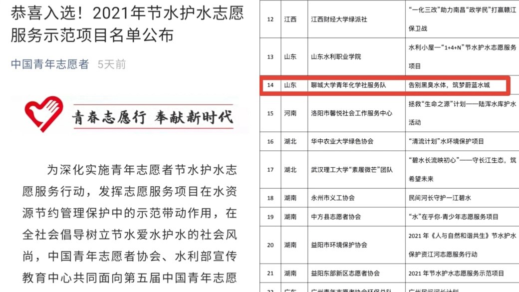 该项目依托聊城大学青年化学社申报的节水护水志愿服务示范项目,拟从“节水”“护水”两方面开展水环境调研和公益实践行动,旨在治理改善因水污染导致的黑臭水体等问题,提升居民的水环境保护意识,助力蔚蓝水城建设。