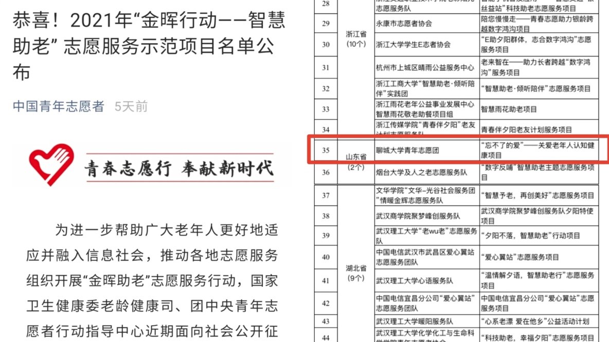 为进一步帮助广大老年人更好地适应并融入信息社会,推动各地志愿服务组织开展“金晖助老”志愿服务行动,国家卫生健康委老龄健康司、团中央青年志愿者行动指导中心近期面向社会公开征集遴选了50个“智慧助老”志愿服务示范项目,旨在引领广大青年志愿者帮助解决老年人智能技术运用困难的问题。我校“忘不了的爱”——关爱老年人认知健康项目入选,山东省仅2项。