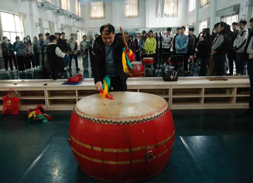 活动开始,洪玉卿为大家进行了临清驾鼓的表演,他向大家介绍了临清驾鼓的历史渊源、民俗背景和发展现状。洪林就临清驾鼓基本理念、击打理念、击鼓技巧进行了详细地讲解。随后,洪林运用敲鼓边、敲鼓帮、鼓槌相击等技巧带领大家演奏,铿锵有力、震撼人心。
