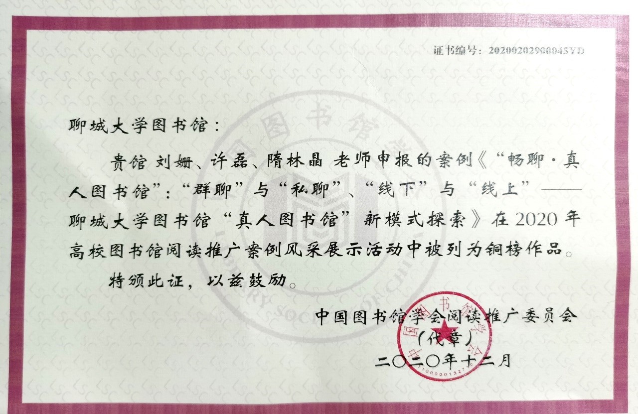 近日,在中国图书馆学会阅读推广委员会主办的“2020年高校图书馆阅读推广案例风采展示活动”中,聊城大学图书馆《“畅聊·真人图书馆”:“群聊”与“私聊”、“线下”与“线上”——聊城大学图书馆“真人图书馆”新模式探索》被列为铜榜作品。
